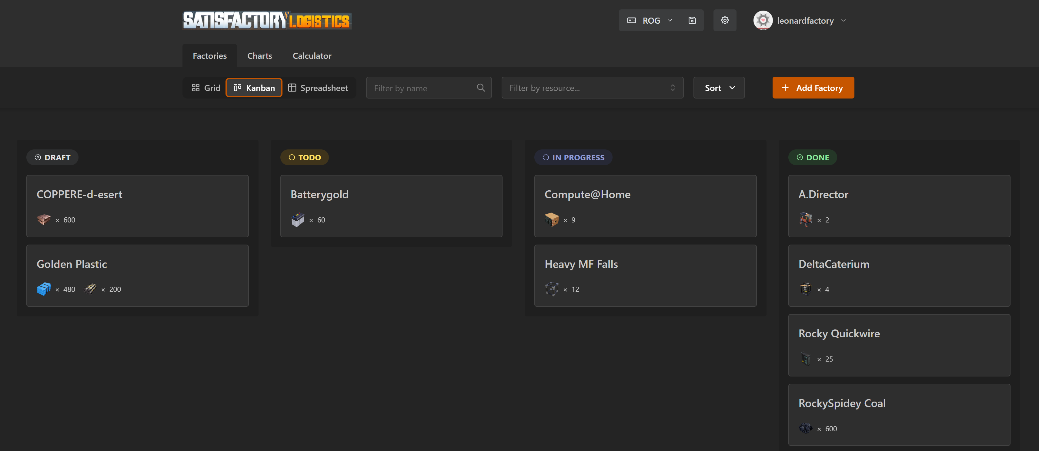 You can now track the build progress of each factory. Assign a status: Draft, Todo, In Progress, or Done, and visualize your megabase plan on a Kanban board with drag-and-drop. No more losing track of which factory you've actually built in-game.