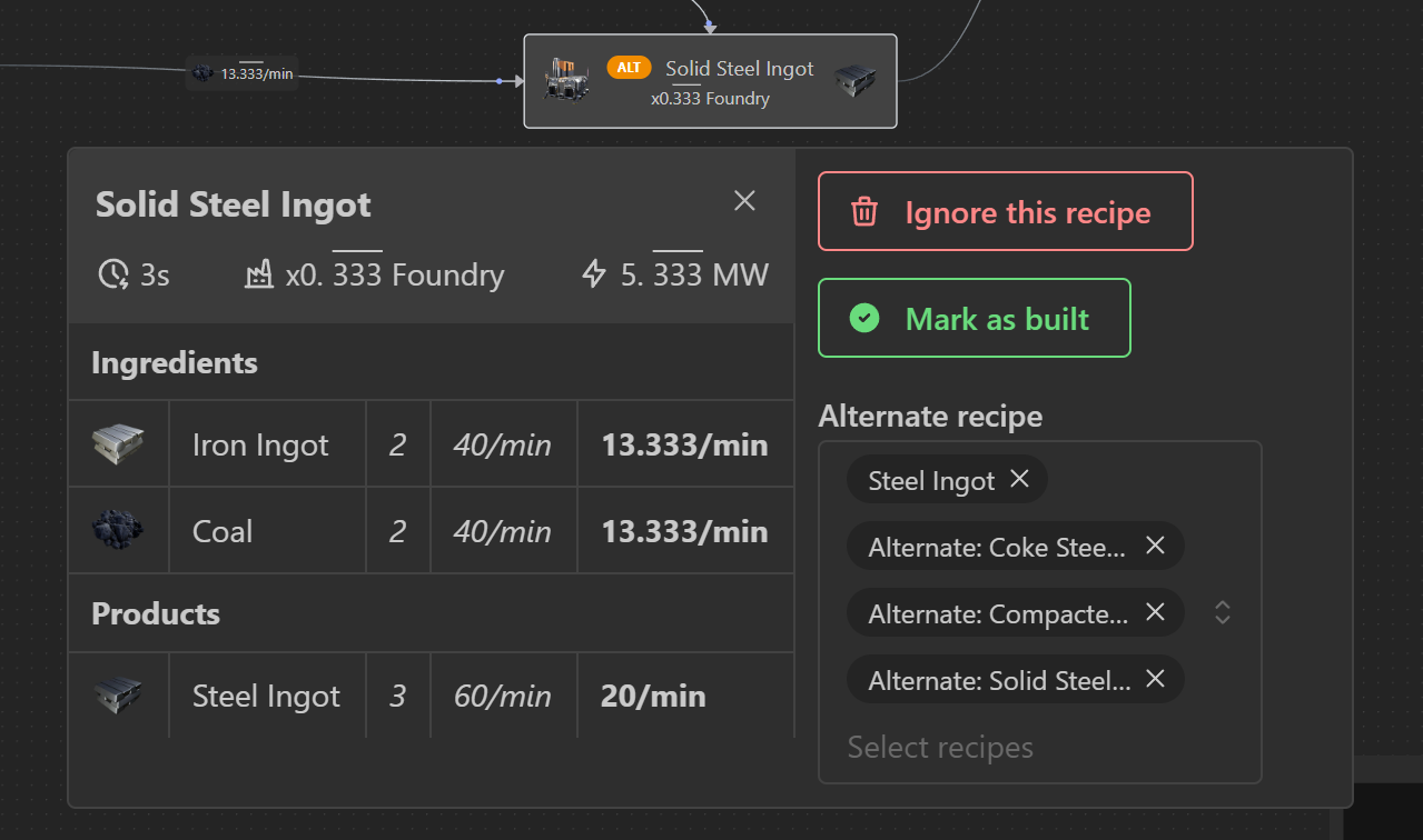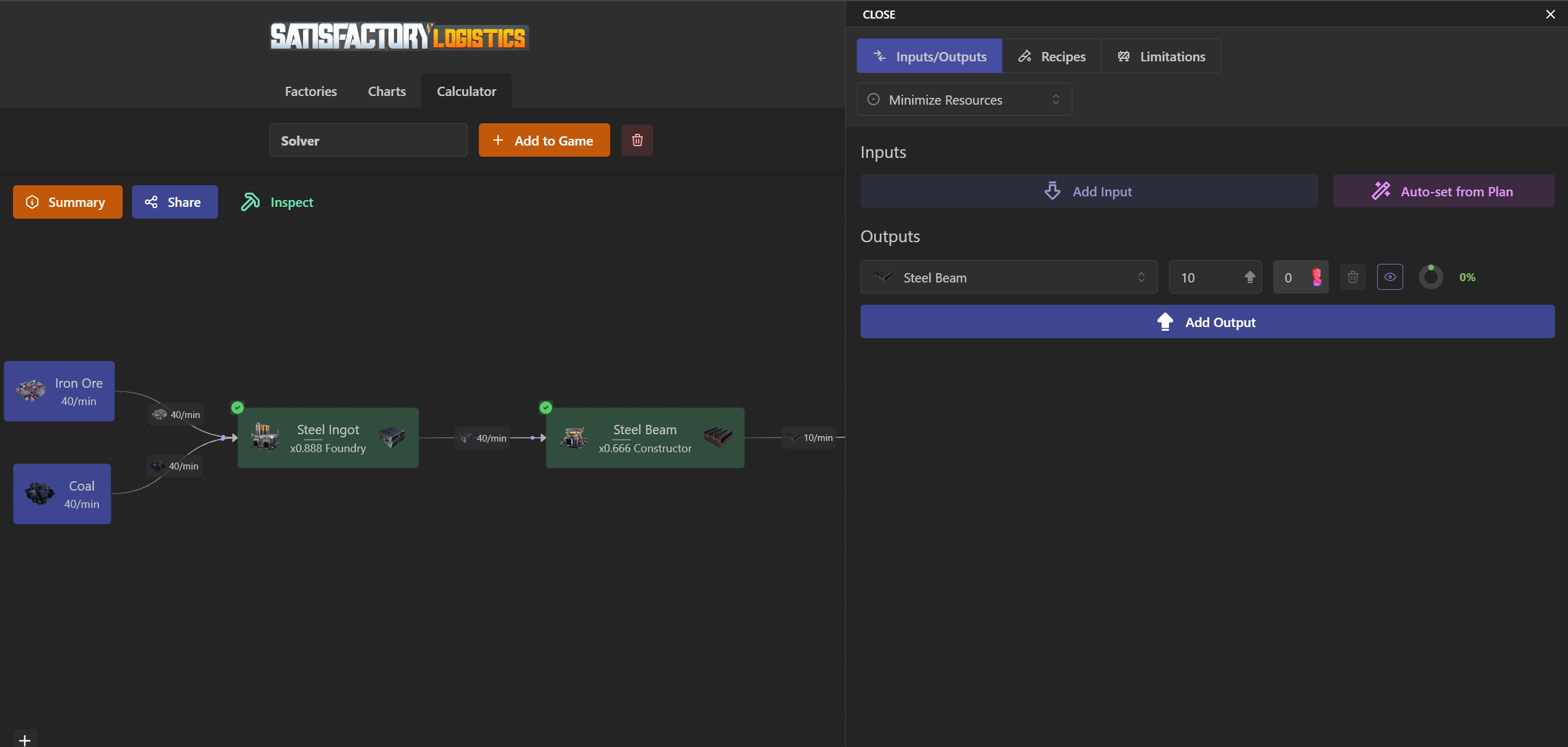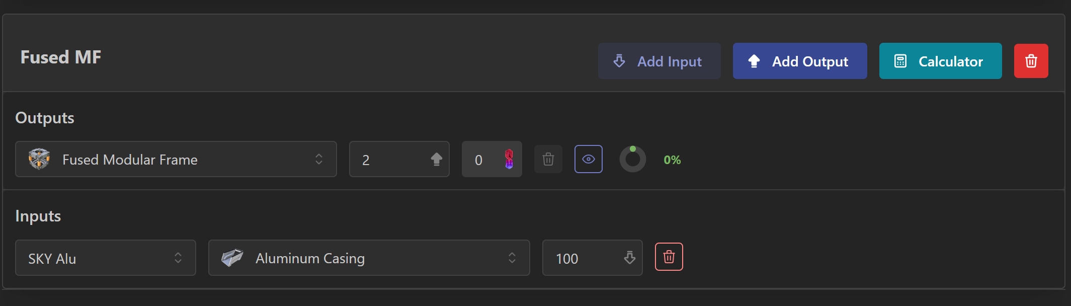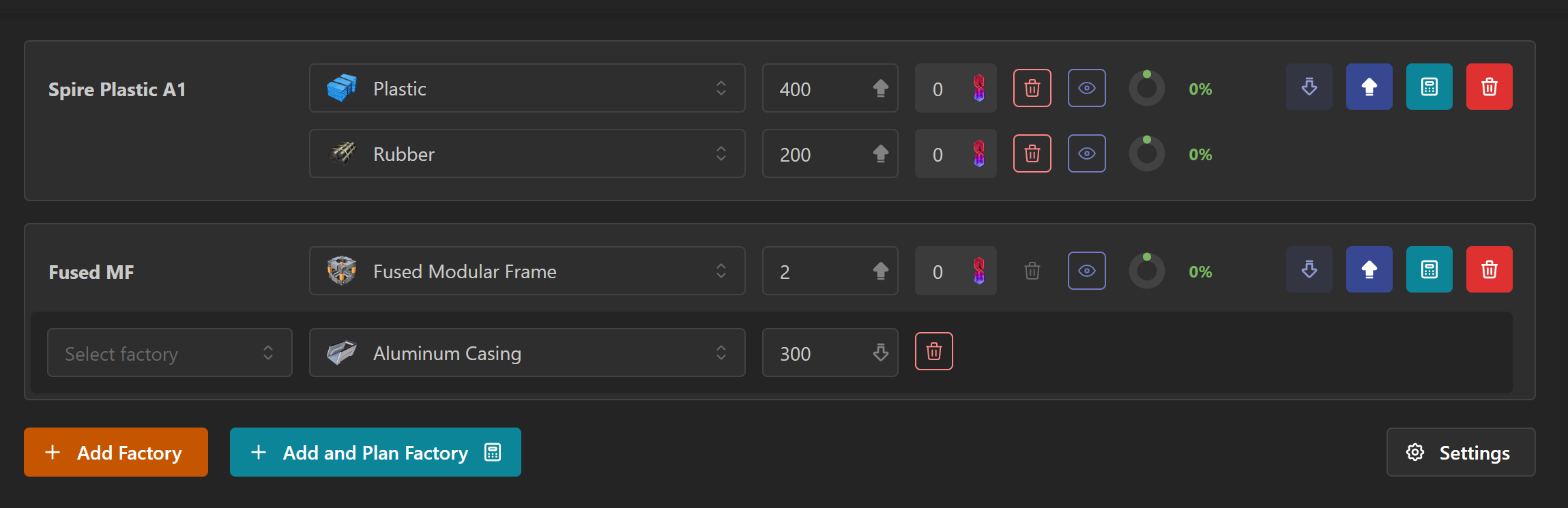 Workflow between calculators and factories has been streamlined. Every plan will be a factory by default. Change inputs & outputs and you’ll see them reflected in realtime in the factories view.