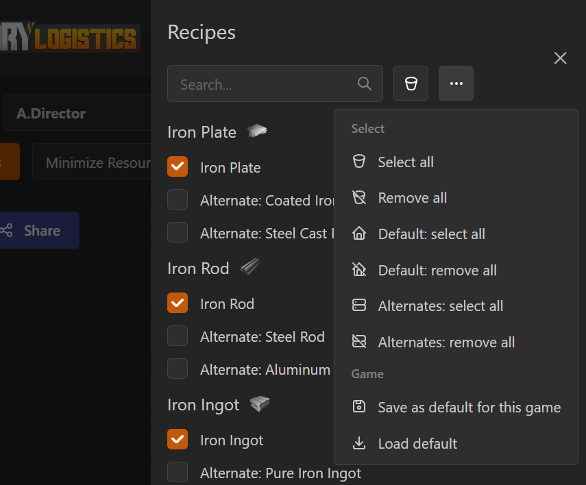 Pick your recipes and save them for your game; next factory will use them. Only default recipes will be selected when starting a new game.