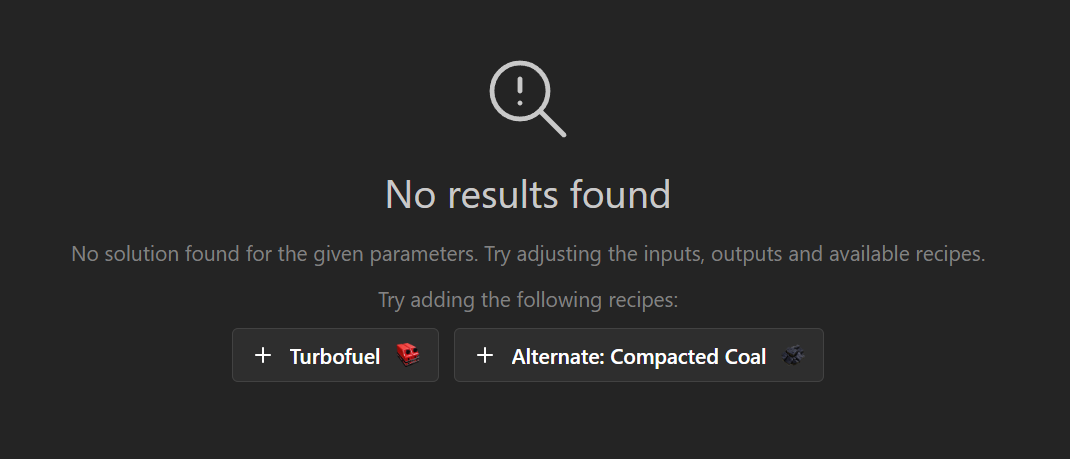 f the currently selected set of recipes isn't sufficient to produce a plan, the system will try to propose alternative recipes which, when enabled, will provide a valid plan. Hope it will help with some common issues cough Turbofuel cough