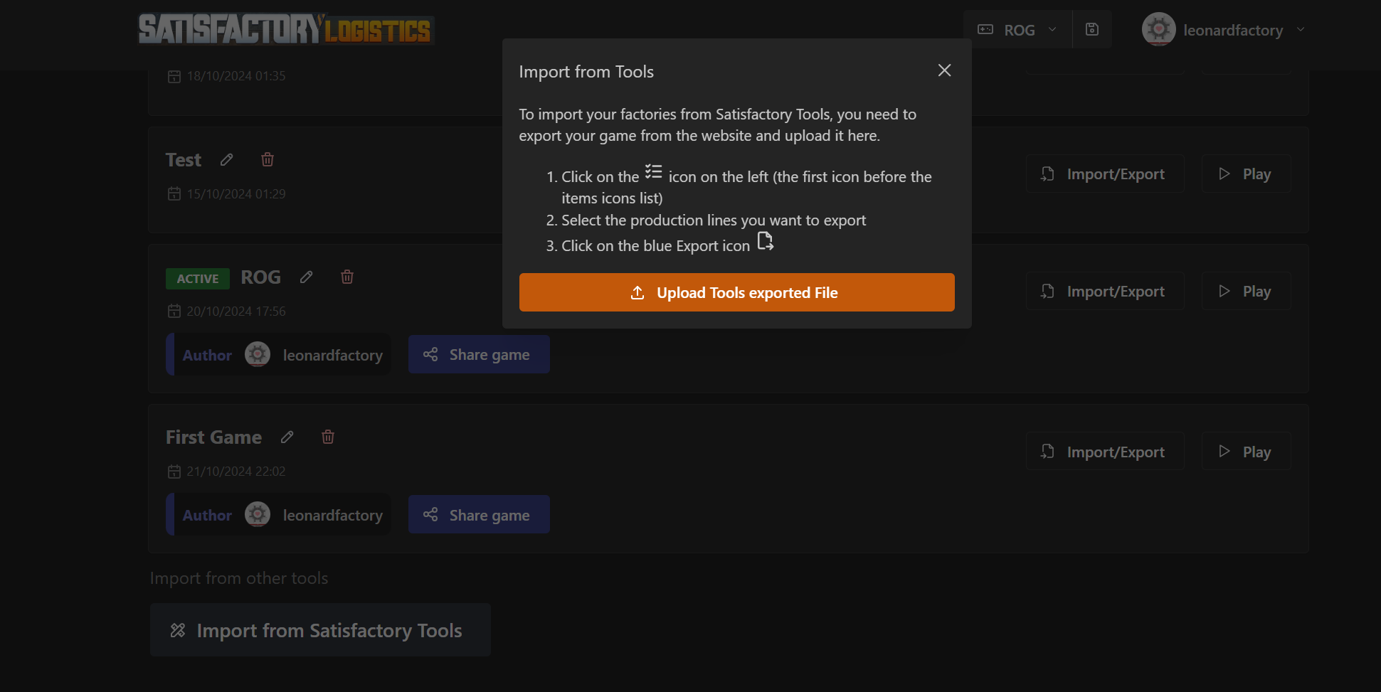 In Games List (from the Game menu) you can now choose “Import from Satisfactory Tools” and after uploading the .txt generated by SFTools, you’ll now see the factories in SL!